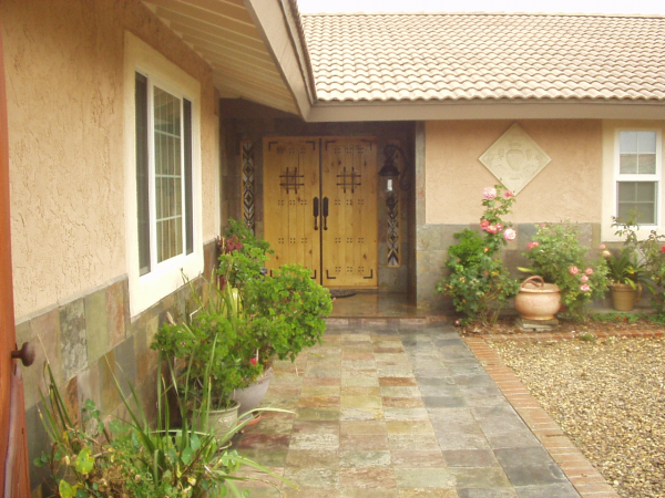 Remodeling & Construction Details: Slate Walkway, Custom Doors, Stain Glass Sidelights, Slate Wainscot, Micro Irrigation, Plant Selection.